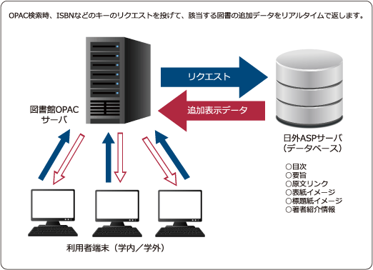 新刊データは毎日、日外ASPサーバ側で更新されます。専用API(Application Programming Interface)を使ってOPACの検索の都度、追加表示データを呼び出します。受入図書にすぐに反映されます。