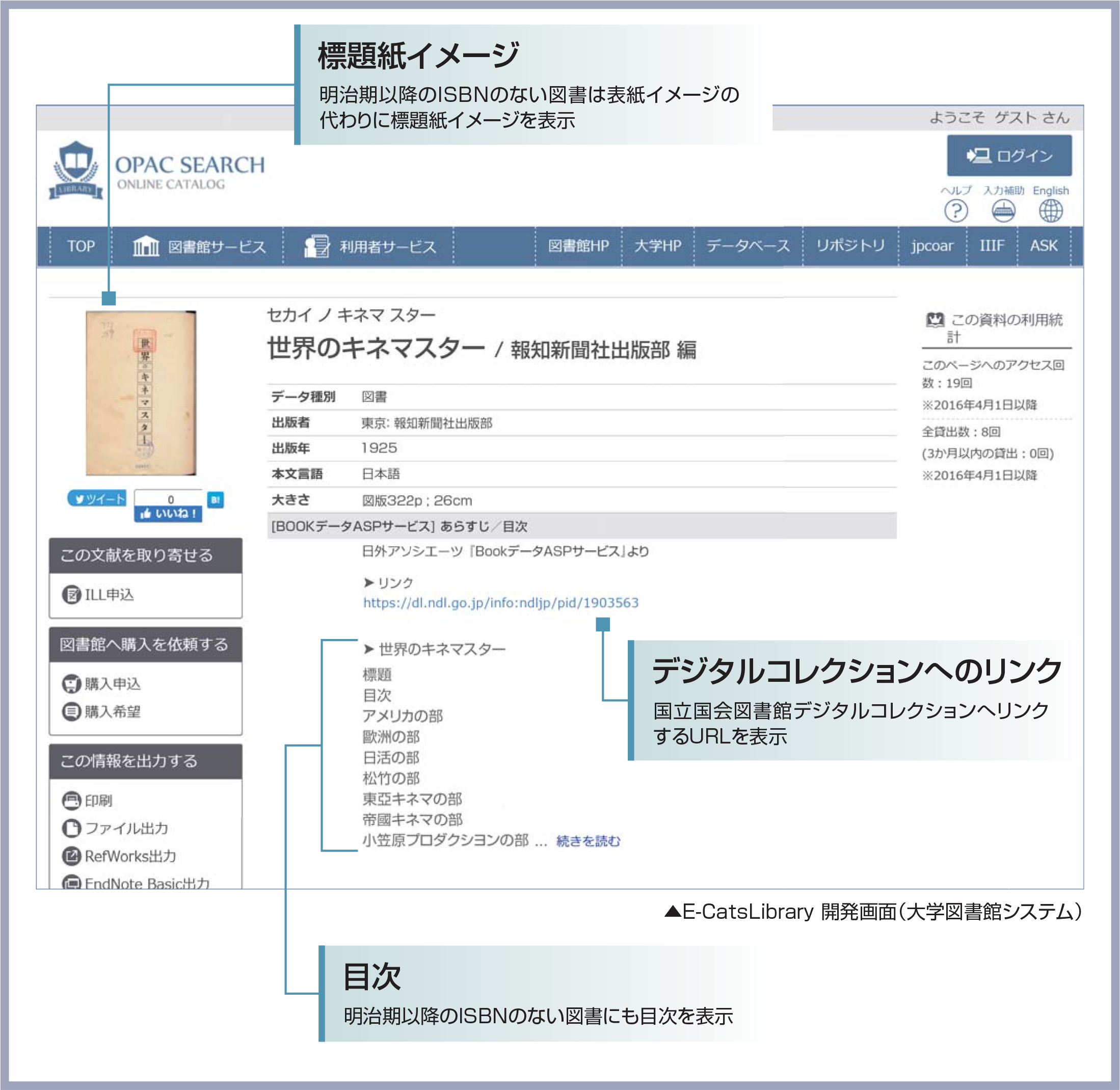 明治期以降のISBNのない図書は「目次」、ISBNのあるものは「目次」「要旨」を表示します。BOOKデータASPサービスPlusでは、「目次」の表示対象が大幅に拡大します。